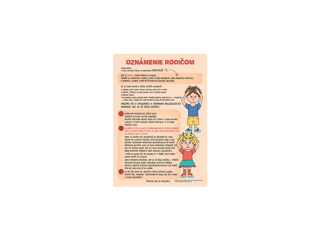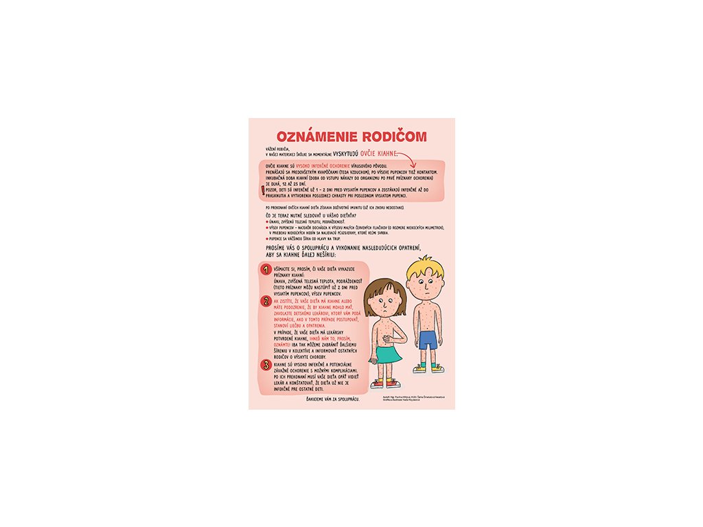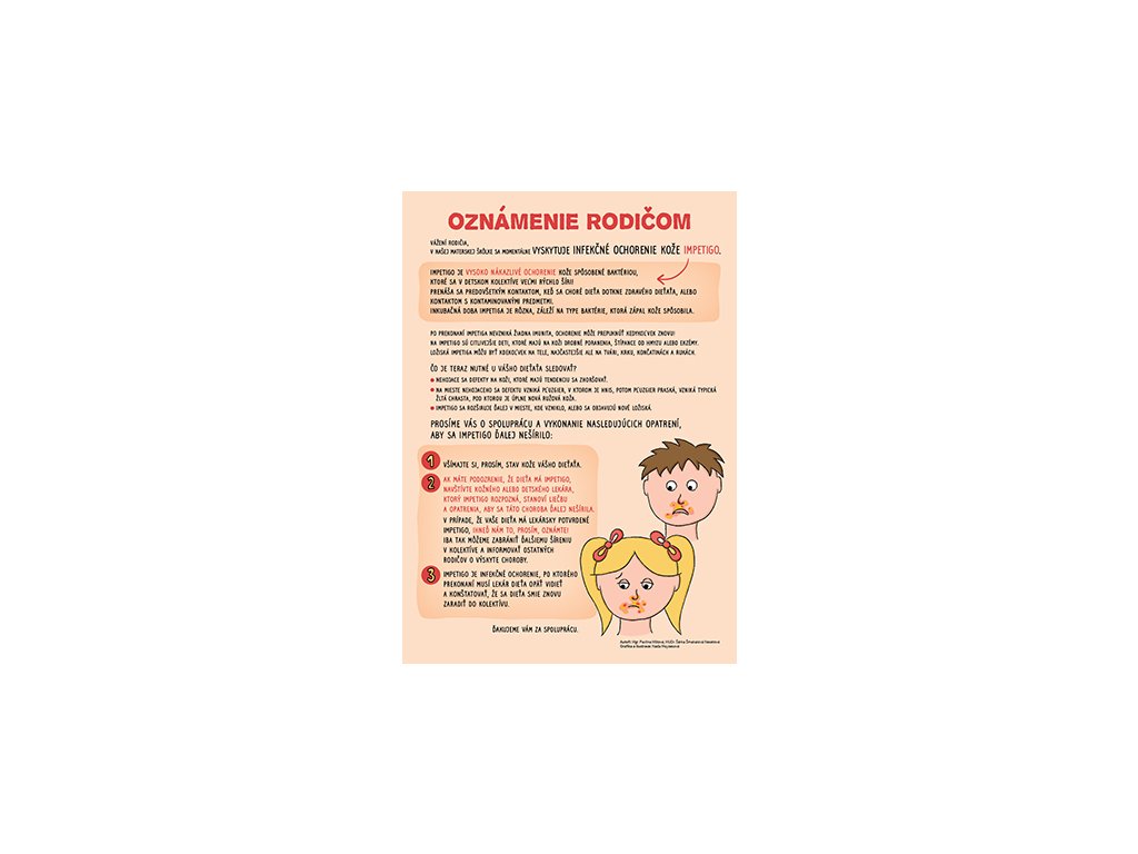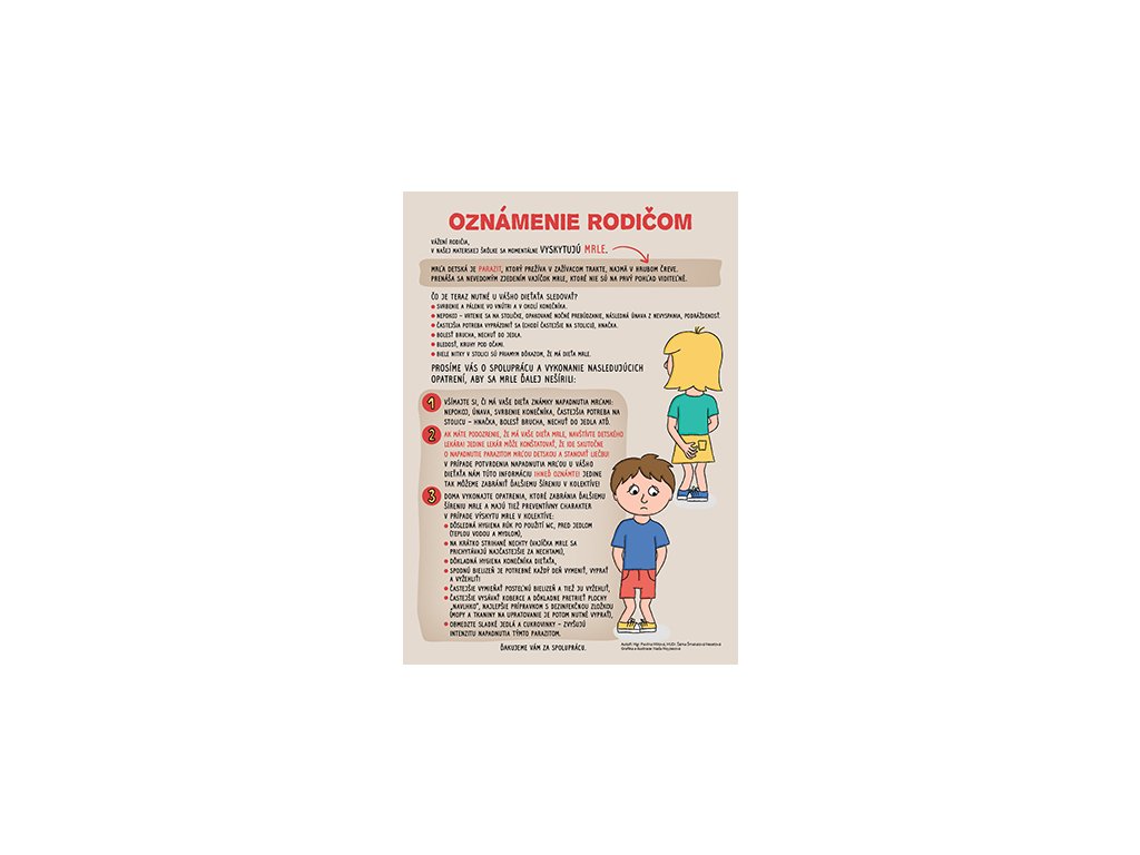 Plagáty neinformujú iba o zvýšenom výskyte infekčného či parazitárneho ochorenia, ale aj o príznakoch ochorenia, na čo si majú rodičia všímať u svojho dieťaťa a aké preventívne opatrenia je vhodné zaviesť, aby sa ochorenie nešírilo ďalej.