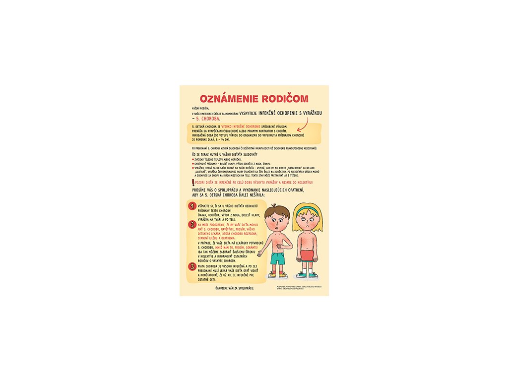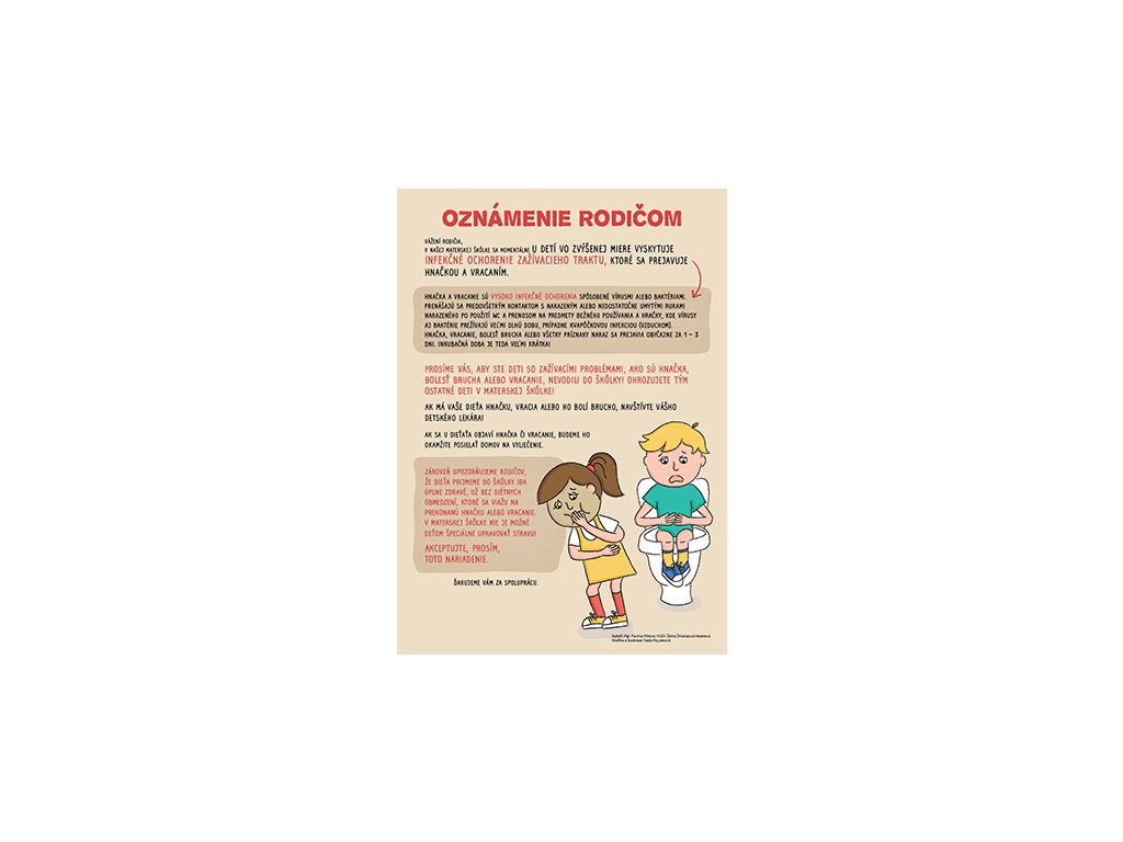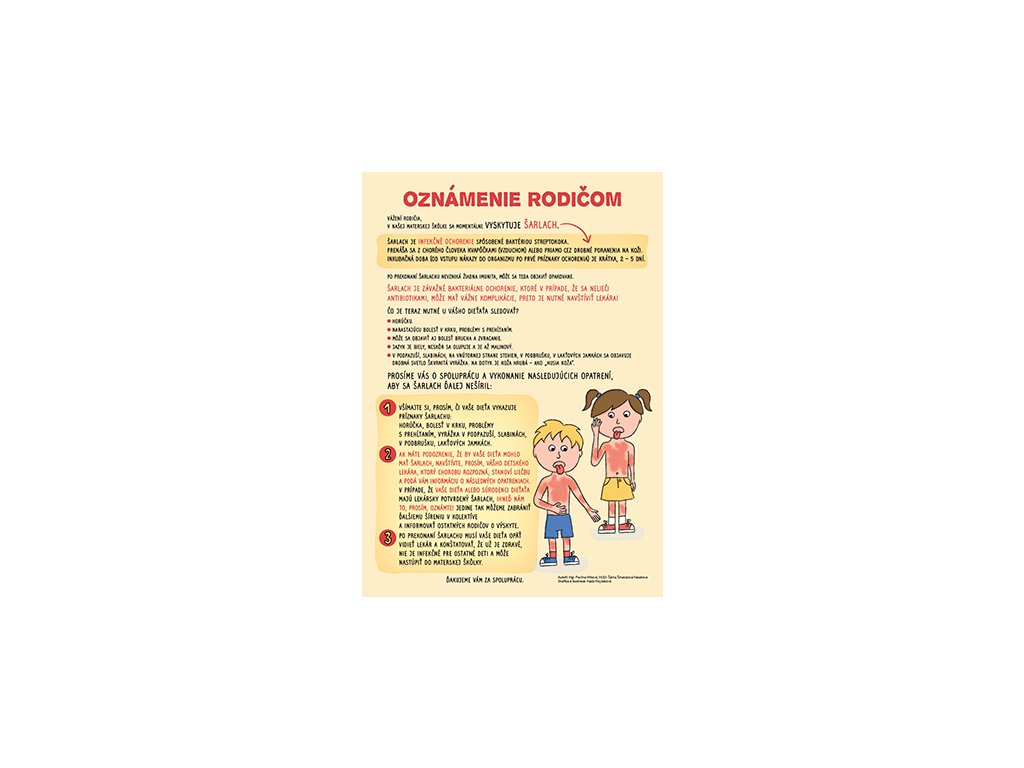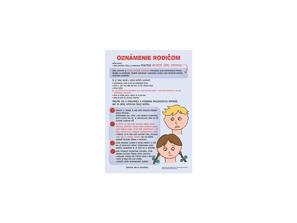Plagáty neinformujú iba o zvýšenom výskyte infekčného či parazitárneho ochorenia, ale aj o príznakoch ochorenia, na čo si majú rodičia všímať u svojho dieťaťa a aké preventívne opatrenia je vhodné zaviesť, aby sa ochorenie nešírilo ďalej.