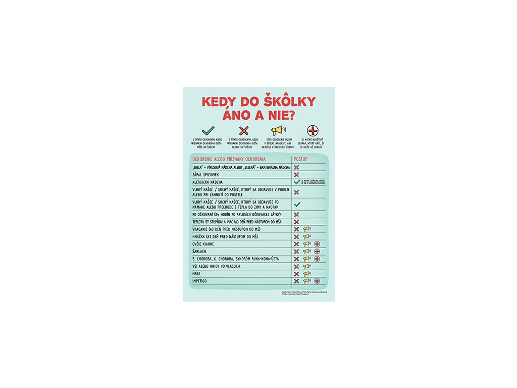 10 plagátov zameraných na výskyt konkrétneho ochorenia v materskej škole a 1 univerzálny plagát: Kedy môže dieťa do škôlky a kedy už nie.